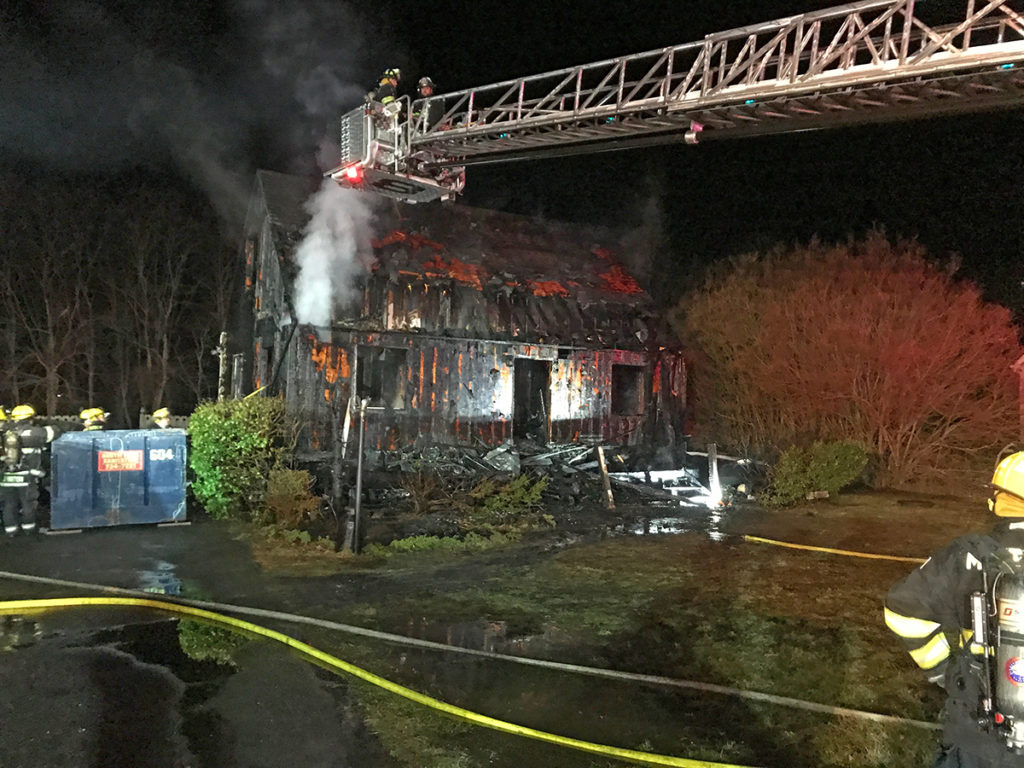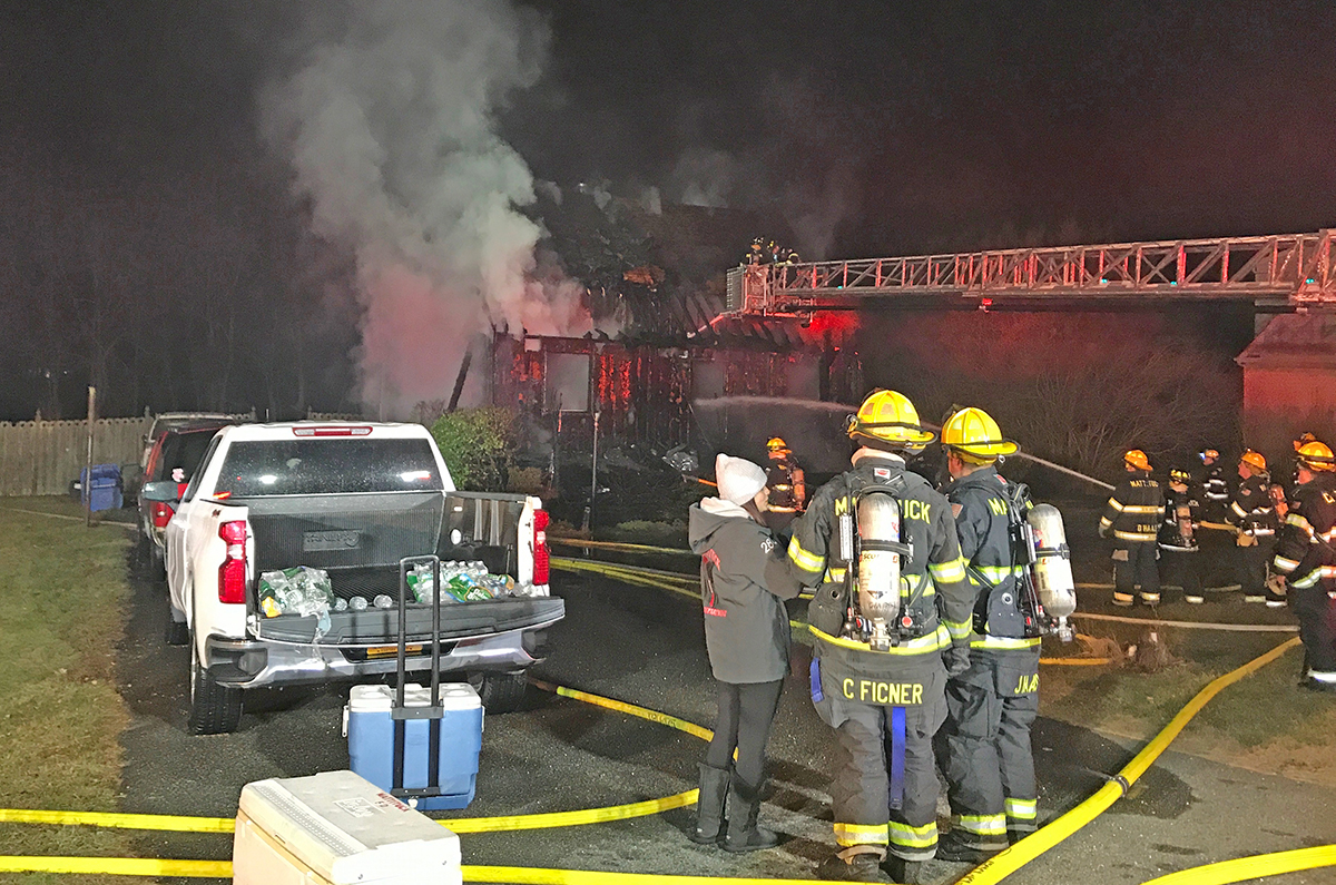 Firefighters with the Mattituck, Cutchogue and Southold Fire Departments responded to the scene at about 9:30 p.m. Firefighters were still pouring water on the charred home after 10:30 p.m.