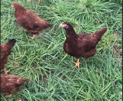 The pullets are a deep mahogany color and are still growing in their wattles and combs. They also have black accents on their tail tips and wing tips.
