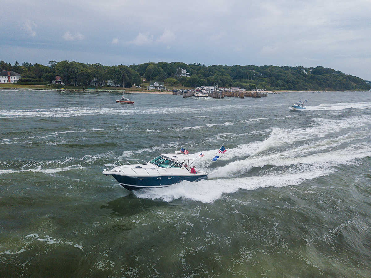 “TrumpStock” was originally scheduled to run from Orient Point to Montauk, but was extended to accommodate an anticipated large number of boats and Trump supporters who had expressed interest in attending. On the morning of the event, just a few dozen boats slowly lined up in Noyac Bay as they made their way east from the north side of Shelter Island, passing Greenport on the way out to the Orient Point Lighthouse and then south to Navy Beach in Montauk.